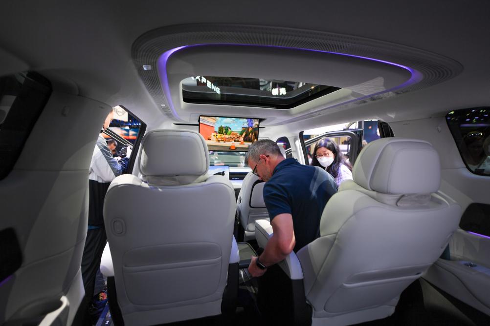 在北京中國國際展覽中心順義館舉行的2024北京車展上,參觀者在小鵬汽車展區(qū)體驗(yàn)小鵬X9新能源汽車(2024年4月25日攝)。新華社記者鞠煥宗攝
