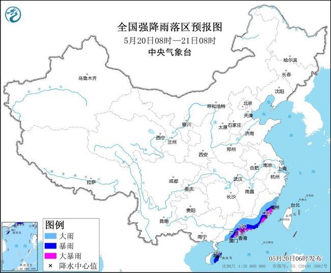 預(yù)計(jì),5月20日08時(shí)至21日08時(shí),廣東中東部、福建東部、海南島中東部等地部分地區(qū)有大到暴雨,其中,廣東南部沿海、福建東南部等地部分地區(qū)有大暴雨(100~150毫米)。上述部分地區(qū)伴有短時(shí)強(qiáng)降水(最大小時(shí)降雨量20~50毫米,局地可超過60毫米),局地有雷暴大風(fēng)等強(qiáng)對流天氣。