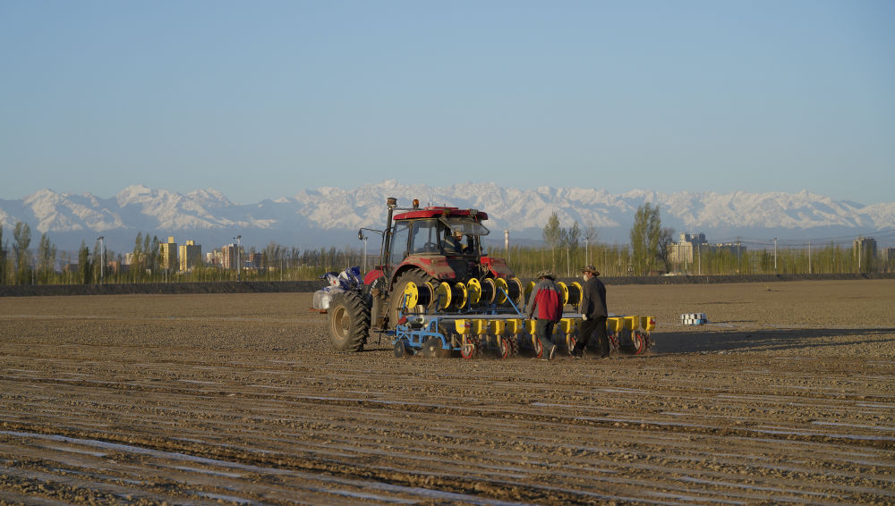 從哈衣繞拉管理的棉田向南望去,可見(jiàn)綿延起伏的天山山脈,終年不化的積雪、線條硬朗的山脊、若隱若現(xiàn)的云杉,像一幅氣勢(shì)磅礴的風(fēng)景畫。一臺(tái)高大的機(jī)器正按照北斗導(dǎo)航設(shè)計(jì)的路線筆直地行進(jìn),車尾安裝的自動(dòng)化播種設(shè)備將透明的薄膜、黑色的滴灌帶、紅色的包衣棉籽,一并整齊地埋進(jìn)褐色的泥土里。
