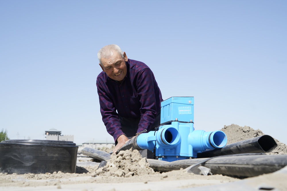 2024年4月19日,在新疆沙灣市,農(nóng)民在棉田里安裝連接泵房和滴灌帶的供水系統(tǒng)。