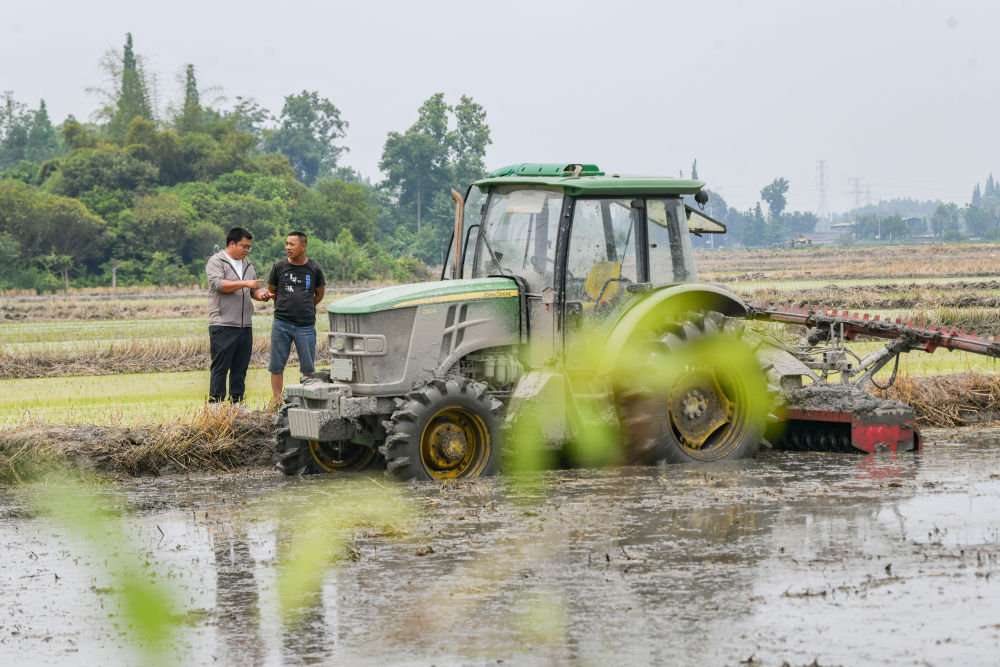 在四川省成都市崇州市大劃街道石橋村,舒星宇(左)在和拖拉機(jī)手溝通翻耕土地的要求(5月15日攝)。