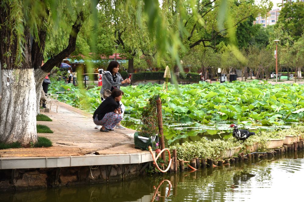 5月20日,游人在翠湖公園與湖中動(dòng)物互動(dòng)。新華社記者 陸君鈺 攝