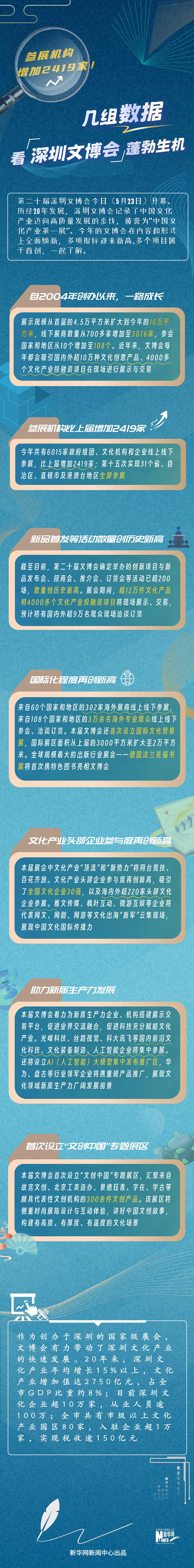 第二十屆深圳文博會今日(5月23日)開幕。歷經20年發(fā)展,深圳文博會記錄了中國文化產業(yè)邁向高質量發(fā)展的步伐,被譽為“中國文化產業(yè)第一展”。今年的文博會在內容和形式上全面煥新,多項指標迎來新高、多個項目屬于首創(chuàng),一起了解。