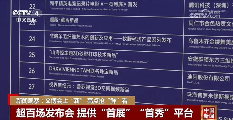 首次設(shè)立國際文化貿(mào)易展,邀請西班牙貿(mào)易協(xié)會、尼泊爾工商聯(lián)合會等國外貿(mào)易機(jī)構(gòu)參展,一站式包攬各地文化產(chǎn)業(yè)精品;在影視·出版·版權(quán)·游戲電競展,首次亮相的“城市文化合伙人”主題展呈現(xiàn)“文化+交易產(chǎn)業(yè)融合新產(chǎn)品”,傳播城市優(yōu)秀文化。據(jù)悉,今年的文博會將舉辦超100場創(chuàng)新項目及新品發(fā)布會和超20場招商會、推介會等,為國內(nèi)外新產(chǎn)品、新技術(shù)、新業(yè)態(tài)、新服務(wù)的發(fā)布提供“首展”“首發(fā)”“首秀”平臺。