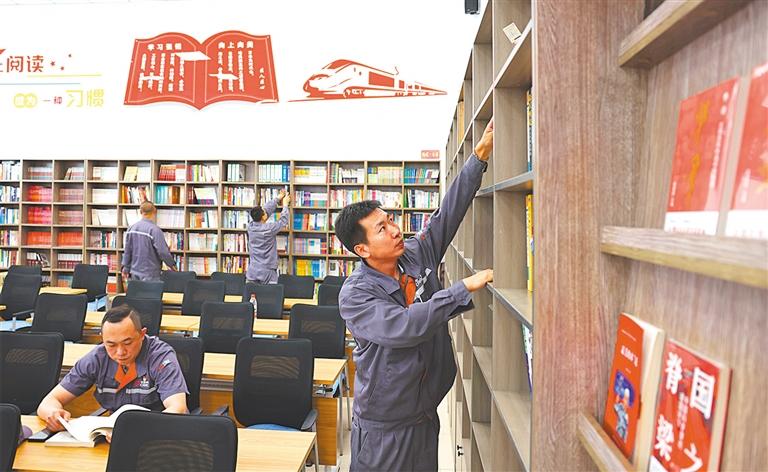▲5月28日,中車長(zhǎng)客職工書屋,周晶輝國(guó)家技能大師工作室成員利用休息時(shí)間忙“充電”。