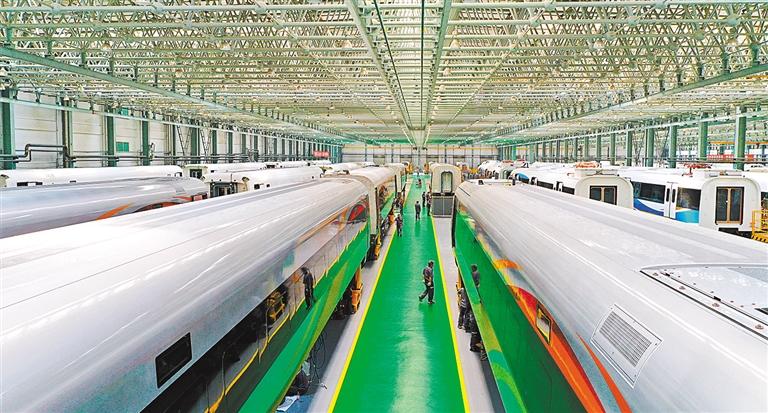 ?5月28日,中車長(zhǎng)客轉(zhuǎn)向架事業(yè)部總成產(chǎn)線組,一臺(tái)臺(tái)轉(zhuǎn)向架排列在數(shù)字化智能產(chǎn)線上。