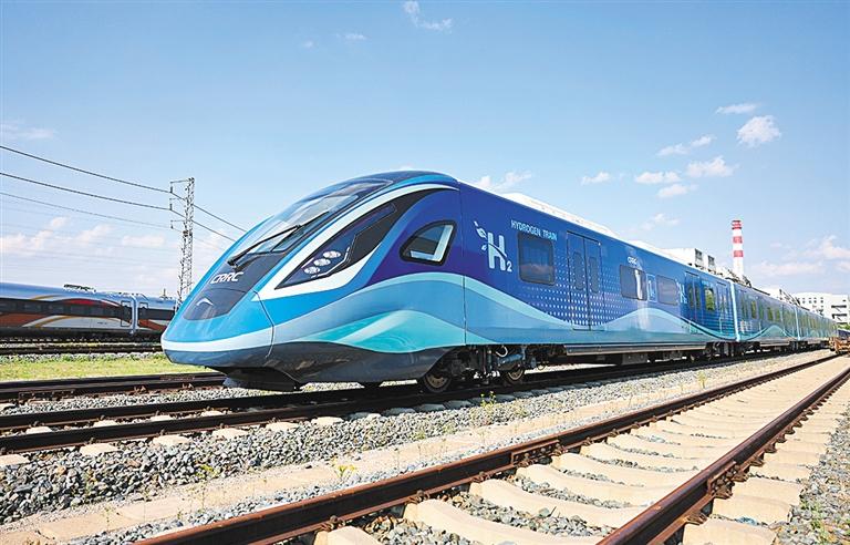 ▲5月28日,中車長(zhǎng)客研制的全國(guó)首列氫能源市域列車。該車已于近期成功完成達(dá)速試跑,標(biāo)志著氫能在軌道交通領(lǐng)域的應(yīng)用取得歷史性突破。