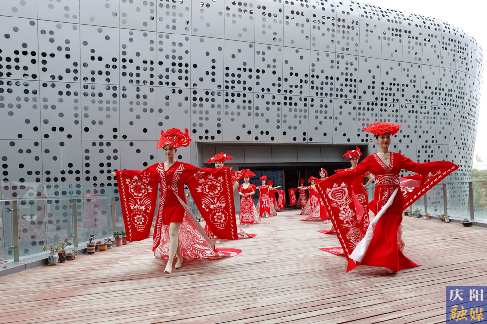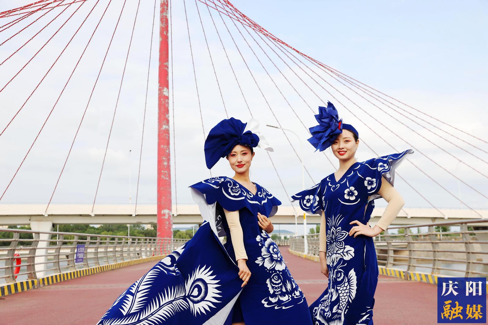 主播們身著刻鏤龍紋、鳳紋、抓髻娃娃、生命樹、魚鉆蓮、牡丹等剪紙紋樣,大V領(lǐng)、魚尾裙、聳肩收腰的“剪云裳”剪紙服裝,行走在傳媒大廈、西峰區(qū)彩虹橋、慶陽市城市海綿運動綠地等處,全方位、多角度地展示了剪紙服裝的特色與魅力。