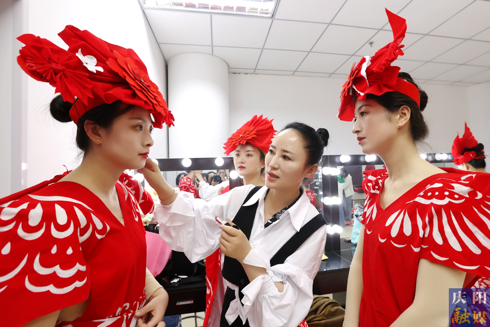 鎮(zhèn)原縣文化館館長、“剪云裳”慶陽剪紙系列服裝設(shè)計者常燕為模特打理造型。