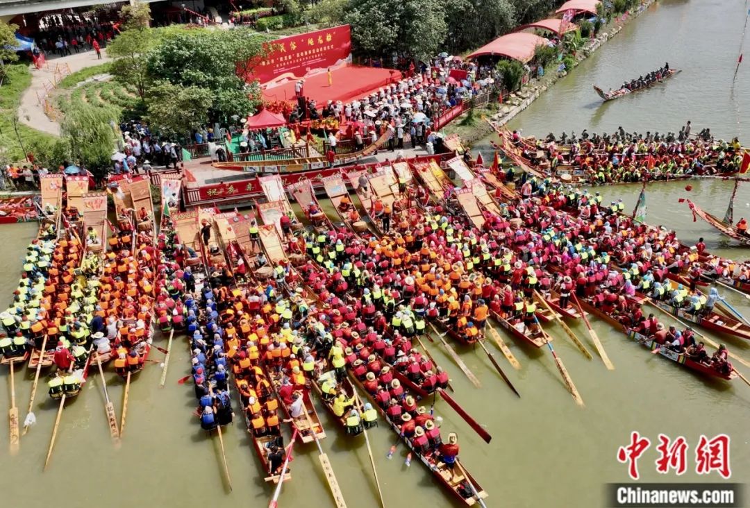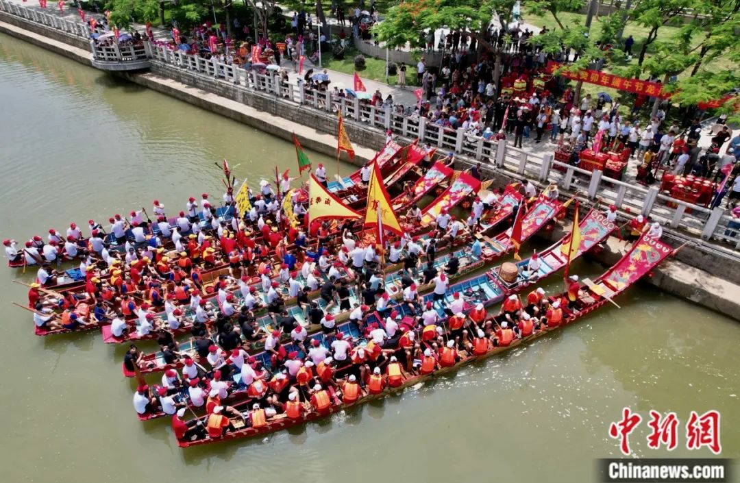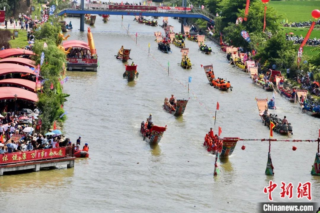 數(shù)十艘龍舟在溪面上來(lái)回穿梭