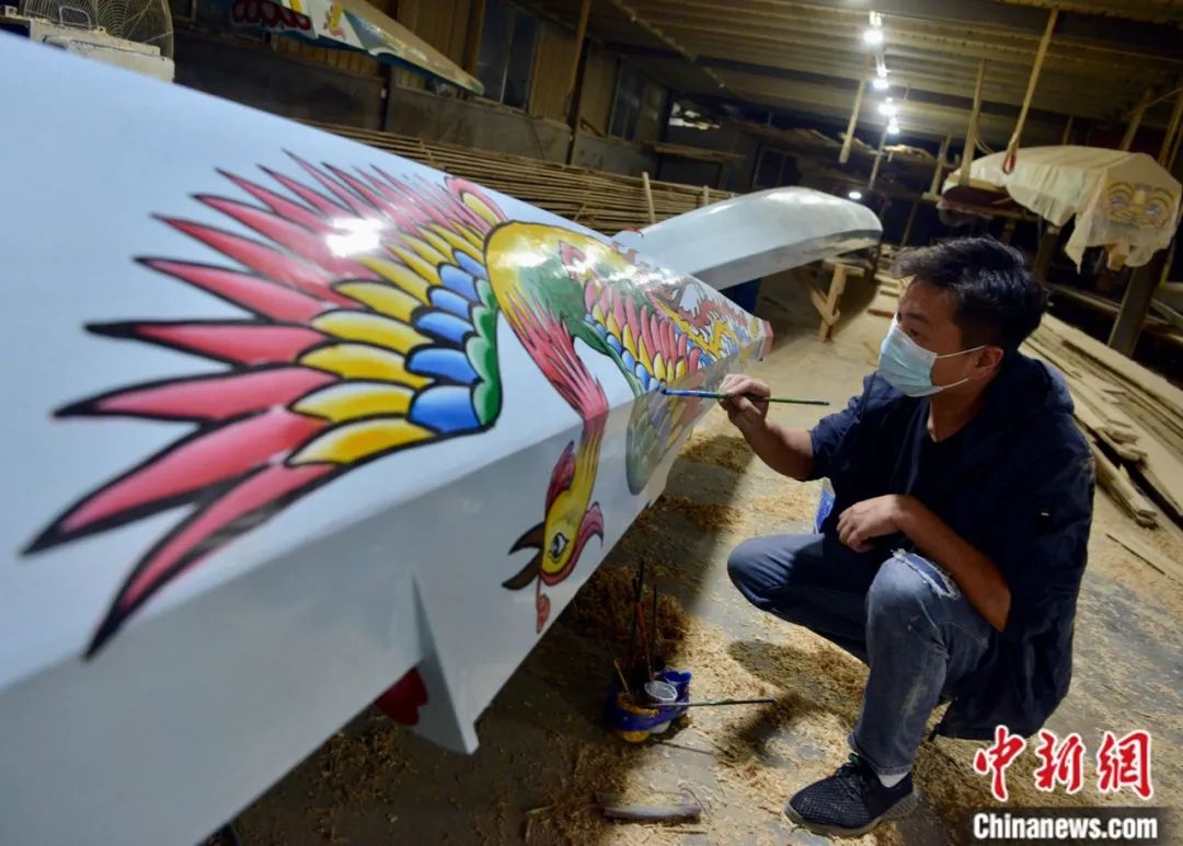 “龍舟世家”方忠雄龍舟廠畫(huà)花師傅在對(duì)龍舟“化妝”。一條龍舟基本是船頭和船身畫(huà)蓮花、壽桃、鯉魚(yú)等,寓意吉祥如意。在船尾,則是畫(huà)龍、鳳、鷹等靈禽猛獸,寓意霸氣威武。中新社記者 張斌 攝