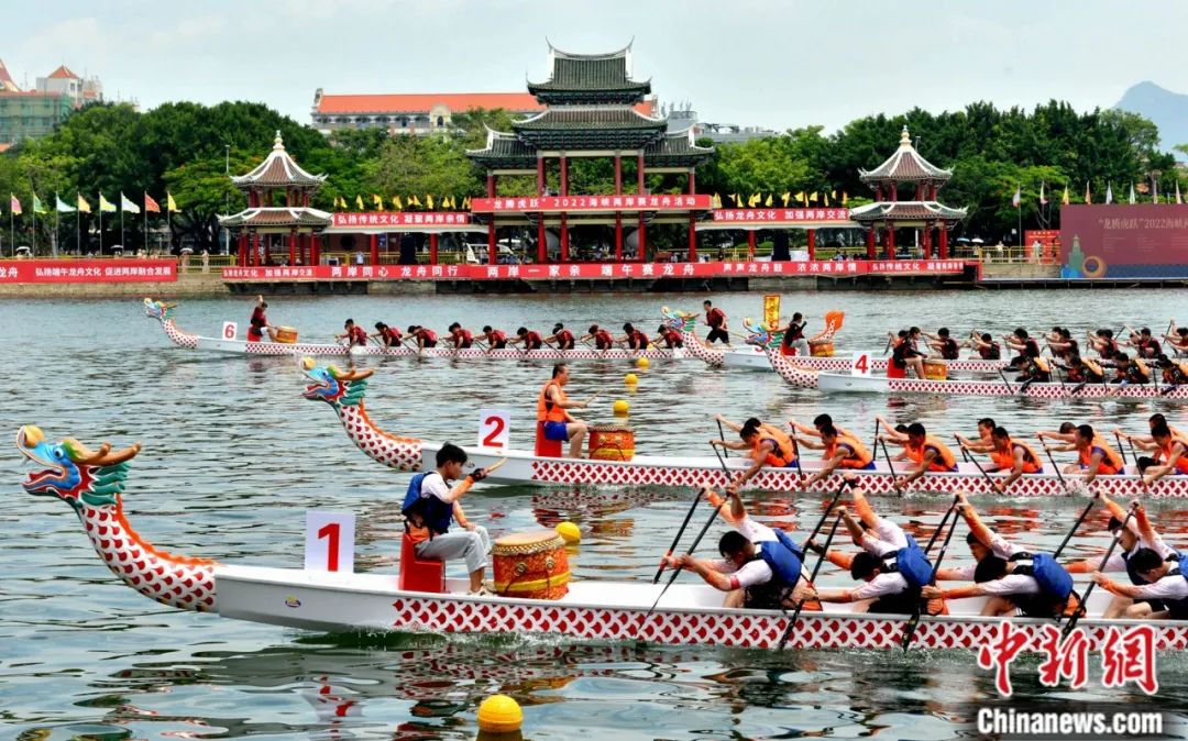 海峽兩岸龍舟賽上,選手們乘風(fēng)逐浪、奮勇?tīng)?zhēng)先。中新社記者 呂明 攝