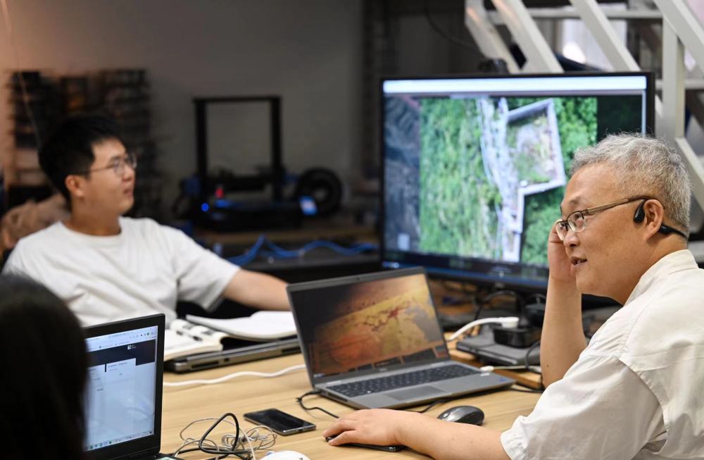 天津大學(xué)建筑學(xué)院教授李哲(右)和學(xué)生在工作室內(nèi)就拍攝的長(zhǎng)城圖像進(jìn)行交流。新華社記者李然 攝