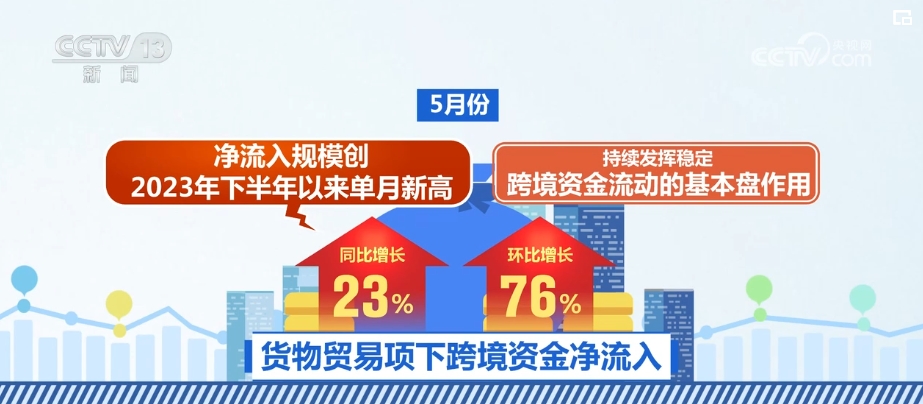 5月份,貨物貿(mào)易項(xiàng)下跨境資金凈流入同比和環(huán)比分別增長23%和76%,凈流入規(guī)模創(chuàng)2023年下半年以來單月新高,持續(xù)發(fā)揮穩(wěn)定跨境資金流動的基本盤作用。同時,外資配置人民幣資產(chǎn)意愿較強(qiáng),5月份,凈買入境內(nèi)債券320億美元,環(huán)比增長86%,處于歷史較高水平。此外,境內(nèi)主體對外各類投資更加平穩(wěn)有序。
