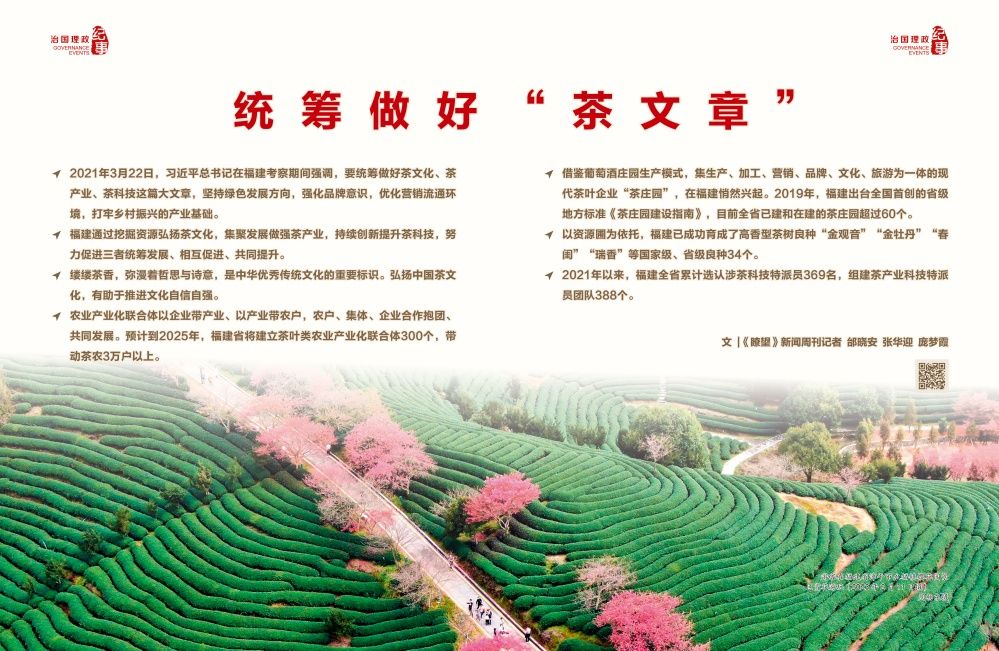 2021年8月,福建省農(nóng)業(yè)農(nóng)村廳出臺《關(guān)于統(tǒng)籌做好“茶文化、茶產(chǎn)業(yè)、茶科技”這篇大文章推動茶產(chǎn)業(yè)高質(zhì)量發(fā)展的若干意見》,制定專項(xiàng)政策措施,各茶葉重點(diǎn)市縣相繼成立工作小組、工作專班,通過挖掘資源弘揚(yáng)茶文化,集聚發(fā)展做強(qiáng)茶產(chǎn)業(yè),持續(xù)創(chuàng)新提升茶科技,努力促進(jìn)三者統(tǒng)籌發(fā)展、相互促進(jìn)、共同提升。