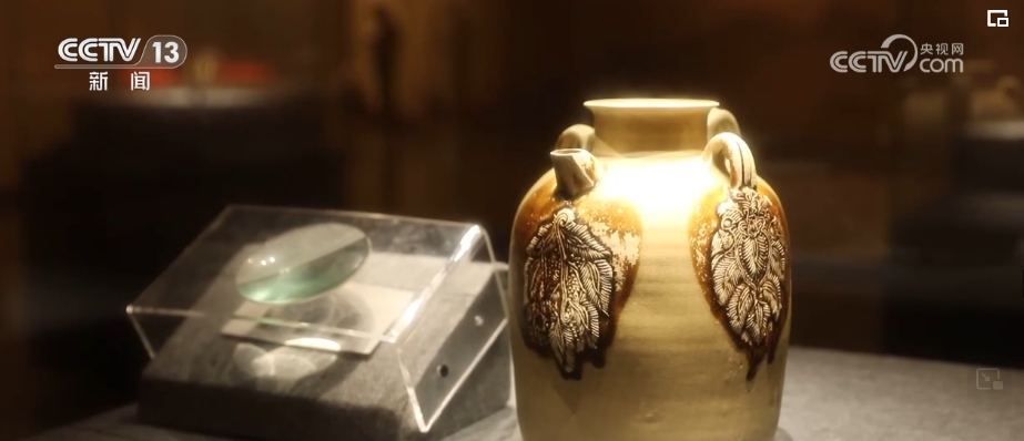 這件青釉褐斑貼花椰棗紋執(zhí)壺就是當(dāng)年回歸的代表作品之一。執(zhí)壺通體施青釉,釉色青中略顯灰黃,肩、腹處模印貼花椰棗紋,其上覆蓋大塊褐色釉,形成三個(gè)橢圓形斑塊,突出了圖案的裝飾效果,器物造型和圖案特殊,是唐代長(zhǎng)沙銅官窯生產(chǎn)的外銷西亞各國(guó)的產(chǎn)品。