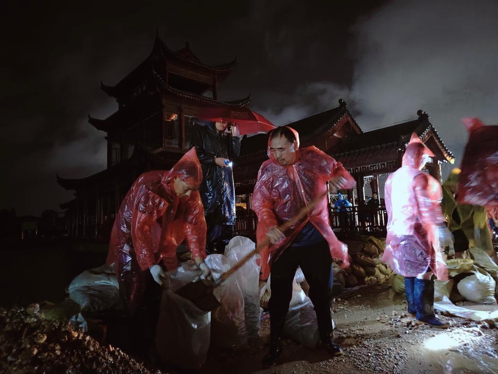 這是7月1日22時在汨羅市湖溪垸楊泗廟堤段拍攝的搶筑子堤場景。(汨羅市融媒體中心供圖)