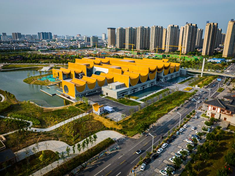 盛夏時節(jié),駐足洛河(大運河洛陽段)之畔,能望見別致的金色屋頂在陽光下熠熠生輝,好似連綿起伏的風(fēng)吹船帆。這里,正是洛陽隋唐大運河文化博物館。