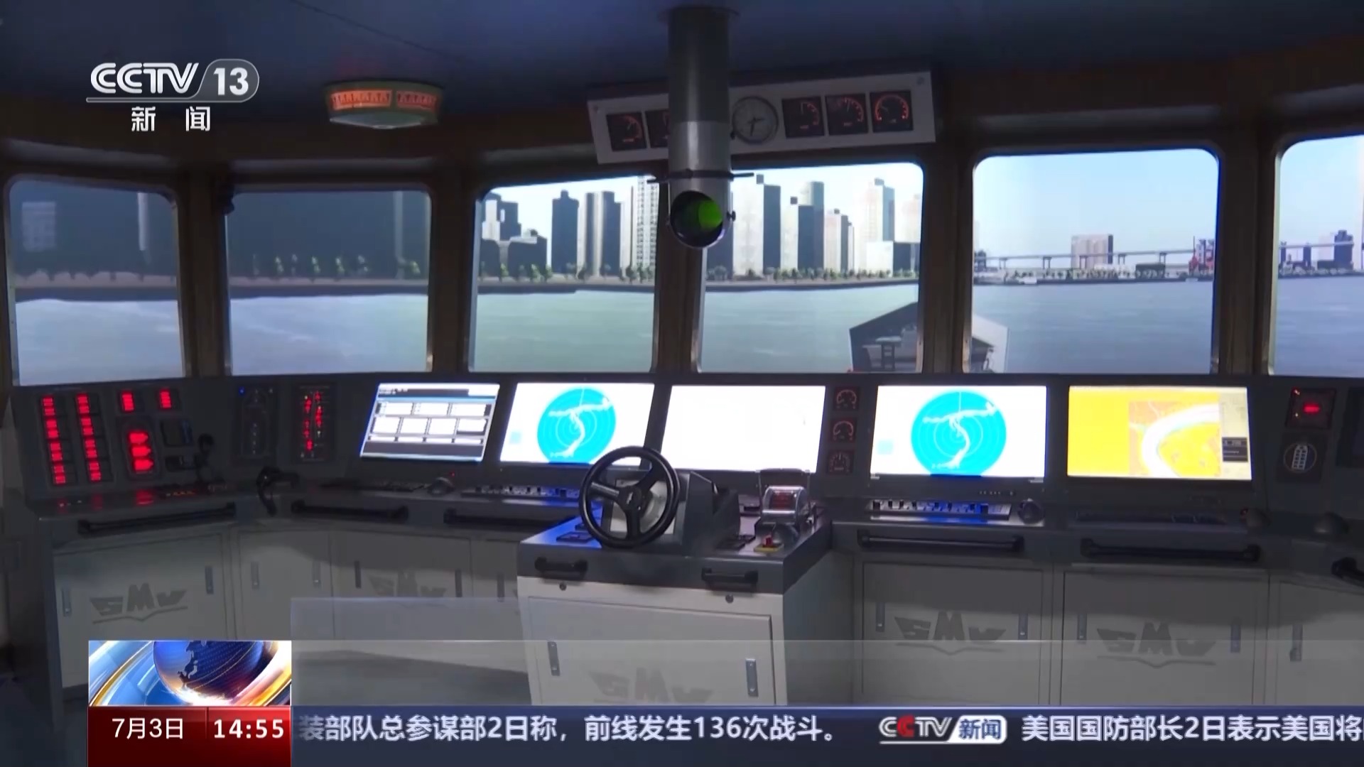 舵輪右手邊的手柄,用來(lái)控制主機(jī)轉(zhuǎn)速。操縱臺(tái)的左右兩邊,為雷達(dá)監(jiān)測(cè)顯示屏幕,代替人眼感知環(huán)境,在霧天航行、夜間航行時(shí)給駕駛員提供便利。它以大型集裝箱船駕駛室為原型,盡可能還原現(xiàn)代化船舶駕駛工作的真實(shí)場(chǎng)景。