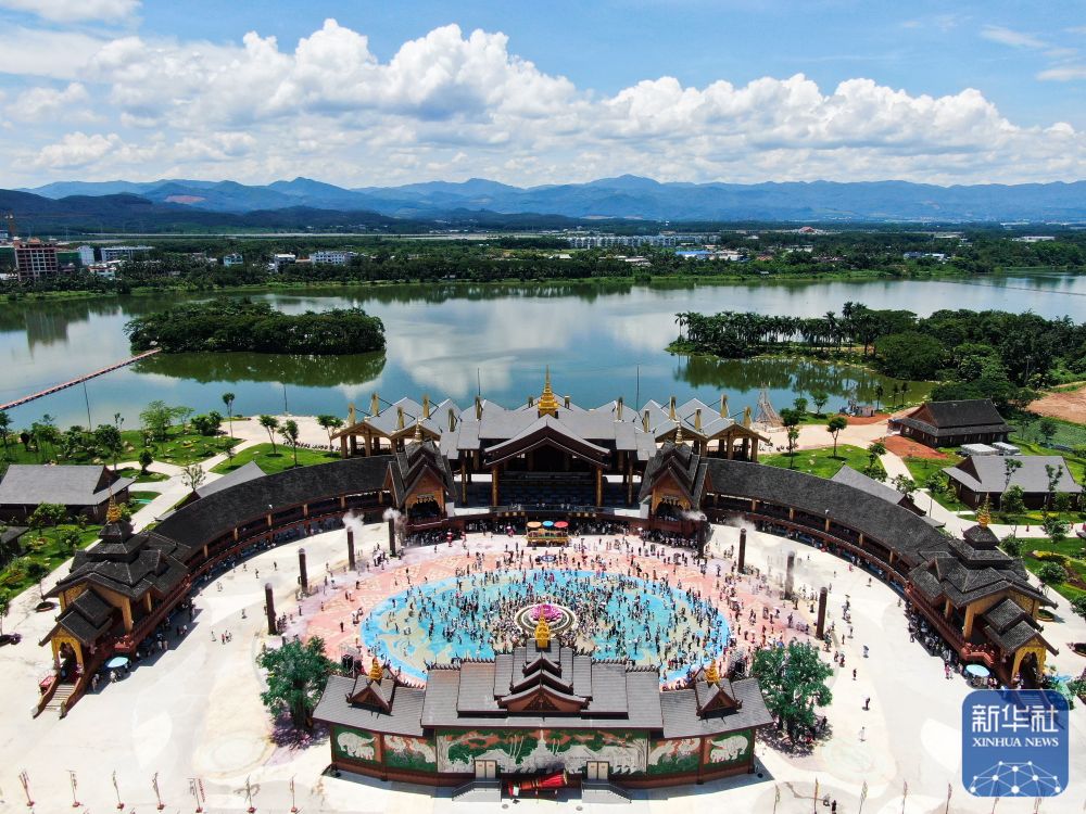 在云南省西雙版納傣族園景區(qū)內(nèi)的傳統(tǒng)傣寨曼聽村,游客參加潑水狂歡活動(dòng)(無人機(jī)照片,7月7日攝)。新華社發(fā)(李云生 攝)