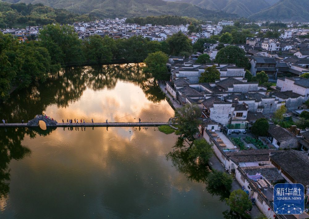 7月7日,游客在安徽省黃山市黟縣宏村游玩(無人機(jī)照片)。新華社記者 杜宇 攝