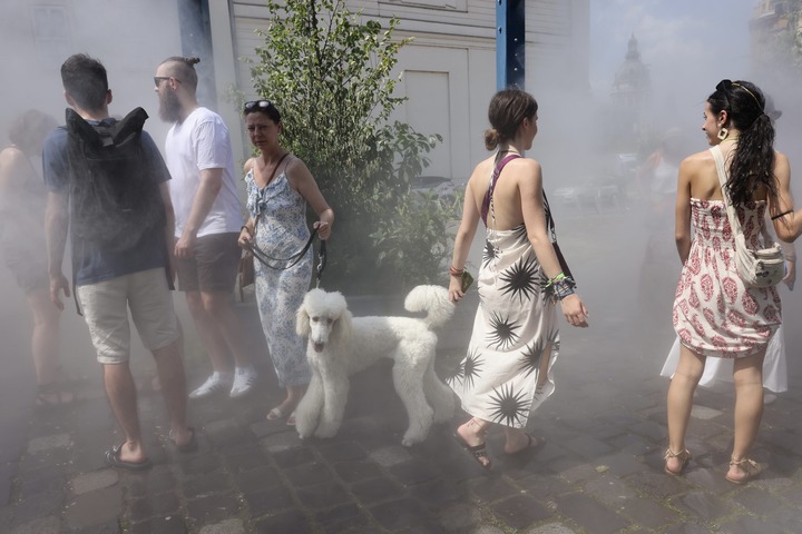 7月11日,在匈牙利布達(dá)佩斯,人們在噴霧裝置中感受清涼一刻。新華社發(fā)(弗爾季·奧蒂洛攝)