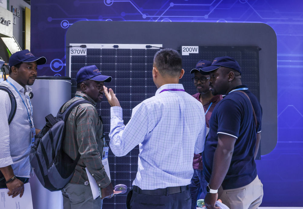 4月15日,參展商在第135屆廣交會(huì)上向采購商介紹太陽能電池組件展品。新華社記者 劉大偉 攝