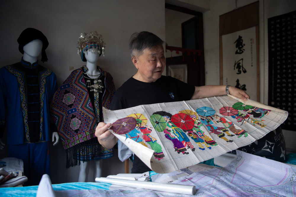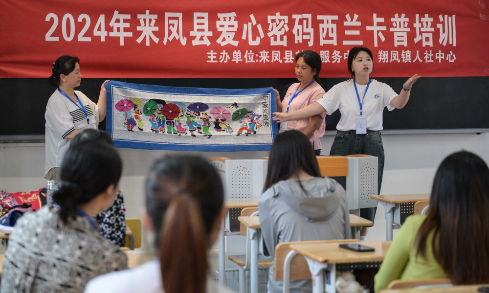 7月2日,唐洪祥的孫女唐鳴珂(后右一)在來鳳縣西蘭卡普培訓班上展示西蘭卡普成品。今年29歲的唐鳴珂國外留學后回到家鄉(xiāng),從事西蘭卡普的傳承發(fā)展工作。