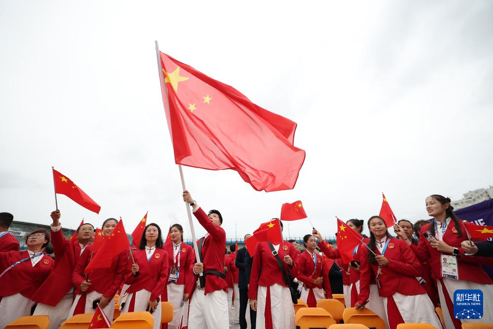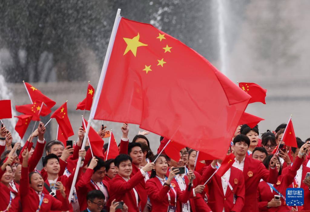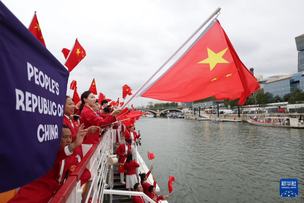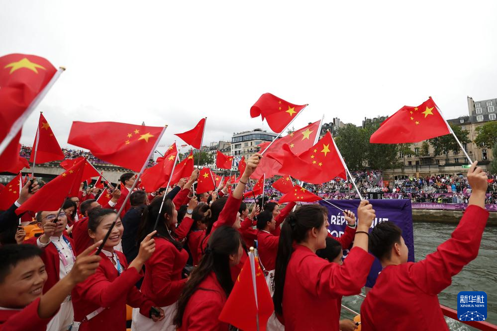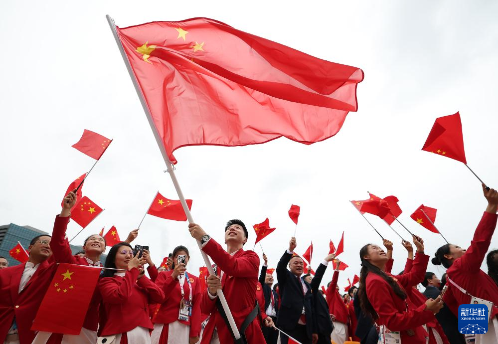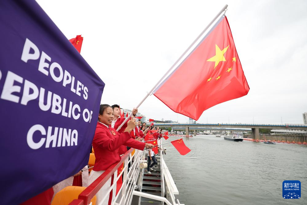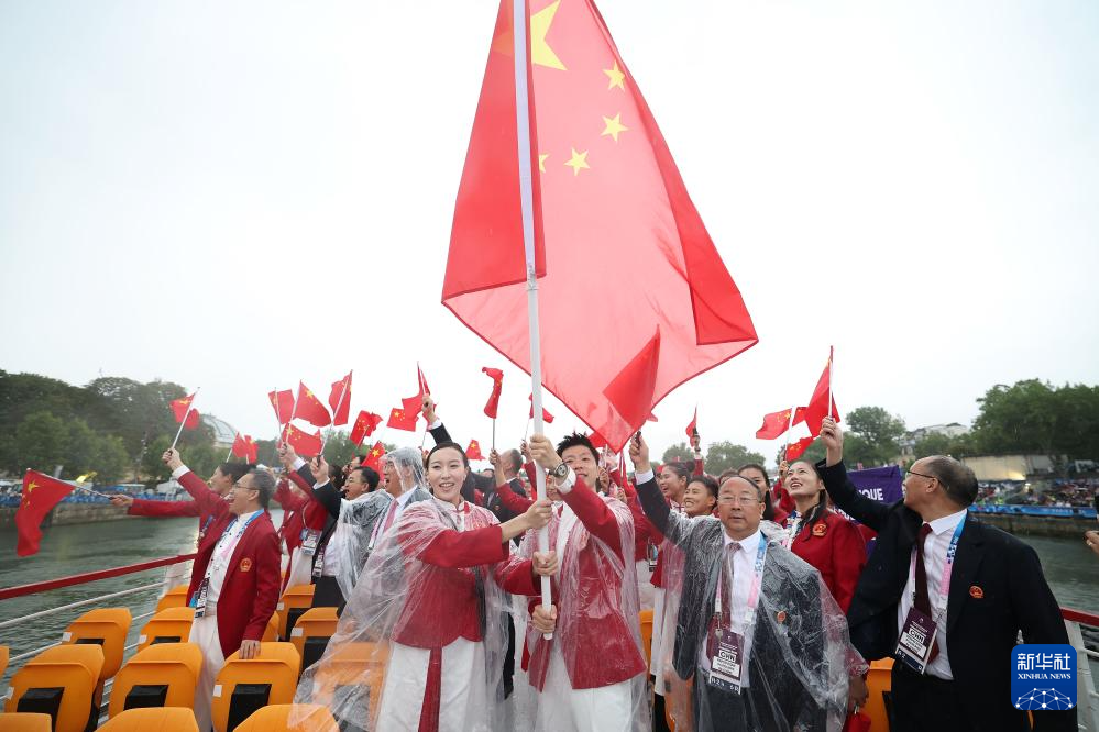 7月26日,中國(guó)體育代表團(tuán)旗手、花樣游泳選手馮雨在開幕式上揮舞國(guó)旗。新華社記者 曹燦 攝