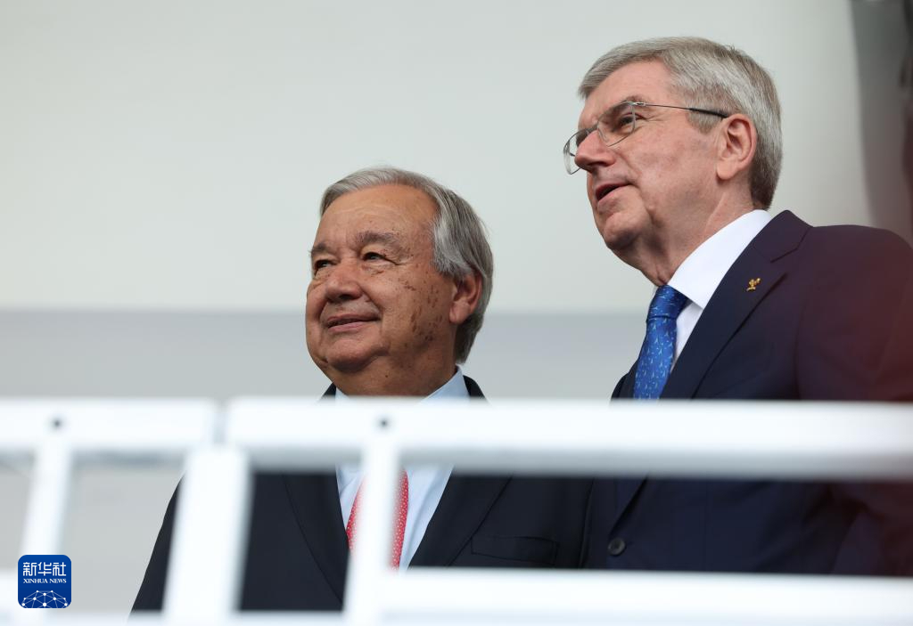 7月26日,國(guó)際奧委會(huì)主席巴赫(右)與聯(lián)合國(guó)秘書長(zhǎng)古特雷斯出席開幕式。新華社記者 高靜 攝pagebreak