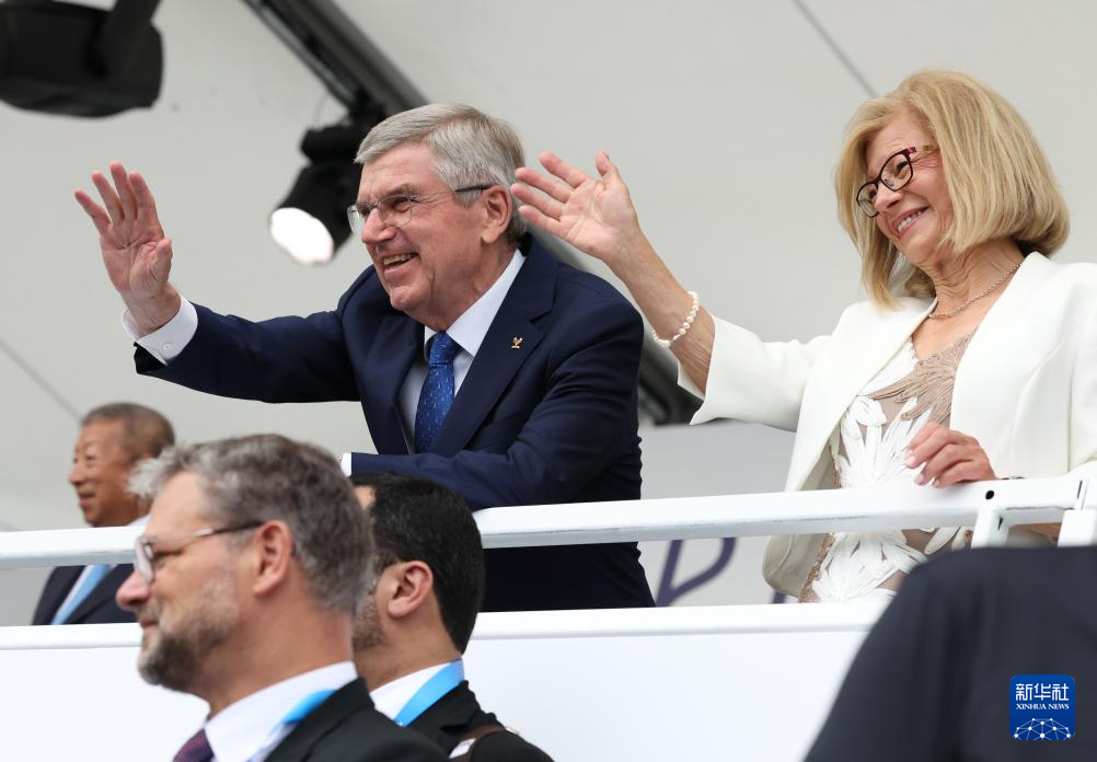 7月26日,國(guó)際奧委會(huì)主席巴赫(中上)在開幕式現(xiàn)場(chǎng)向觀眾致意。新華社記者 高靜 攝
