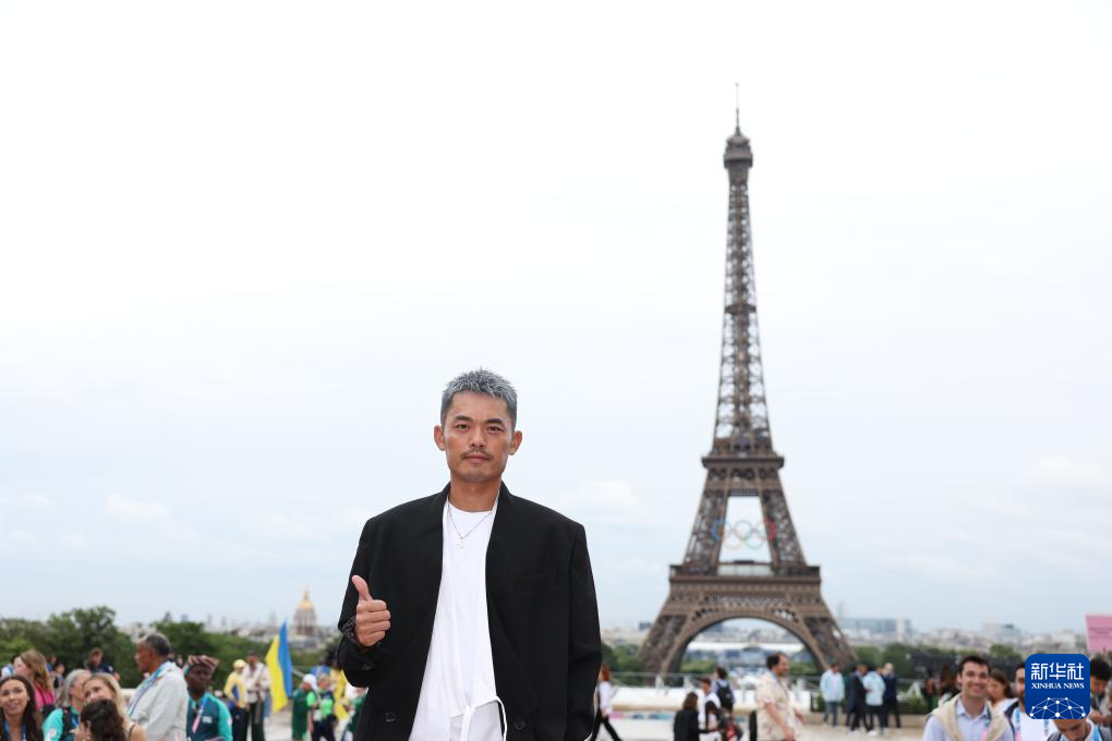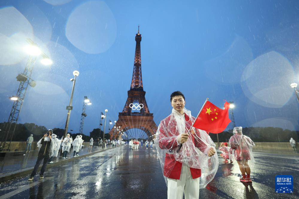 7月26日,中國(guó)體育代表團(tuán)旗手、乒乓球選手馬龍?jiān)诎7茽栬F塔前。新華社記者 李明 攝
