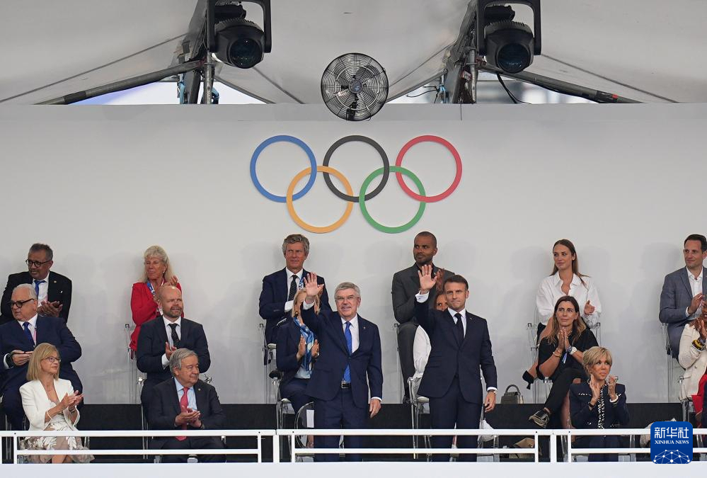 7月26日,國(guó)際奧委會(huì)主席巴赫(上左)和法國(guó)總統(tǒng)馬克龍出席開幕式。新華社記者 高靜 攝