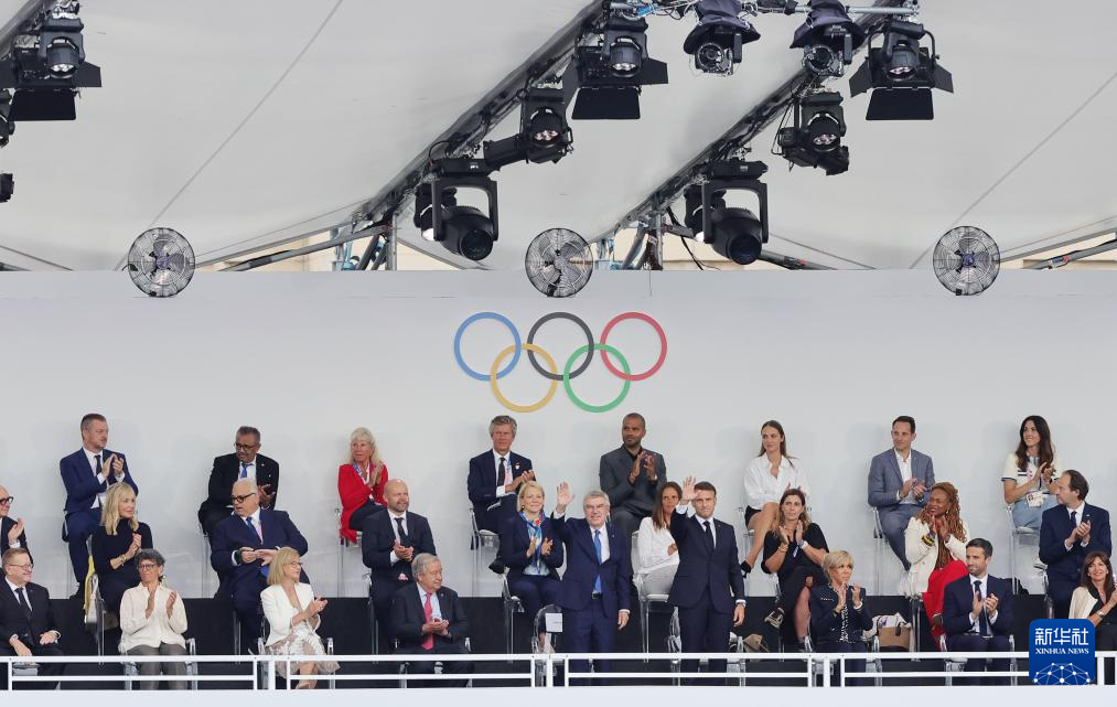 7月26日,國(guó)際奧委會(huì)主席巴赫(前排左五)和法國(guó)總統(tǒng)馬克龍(前排右四)出席開幕式。新華社記者 沈伯韓 攝