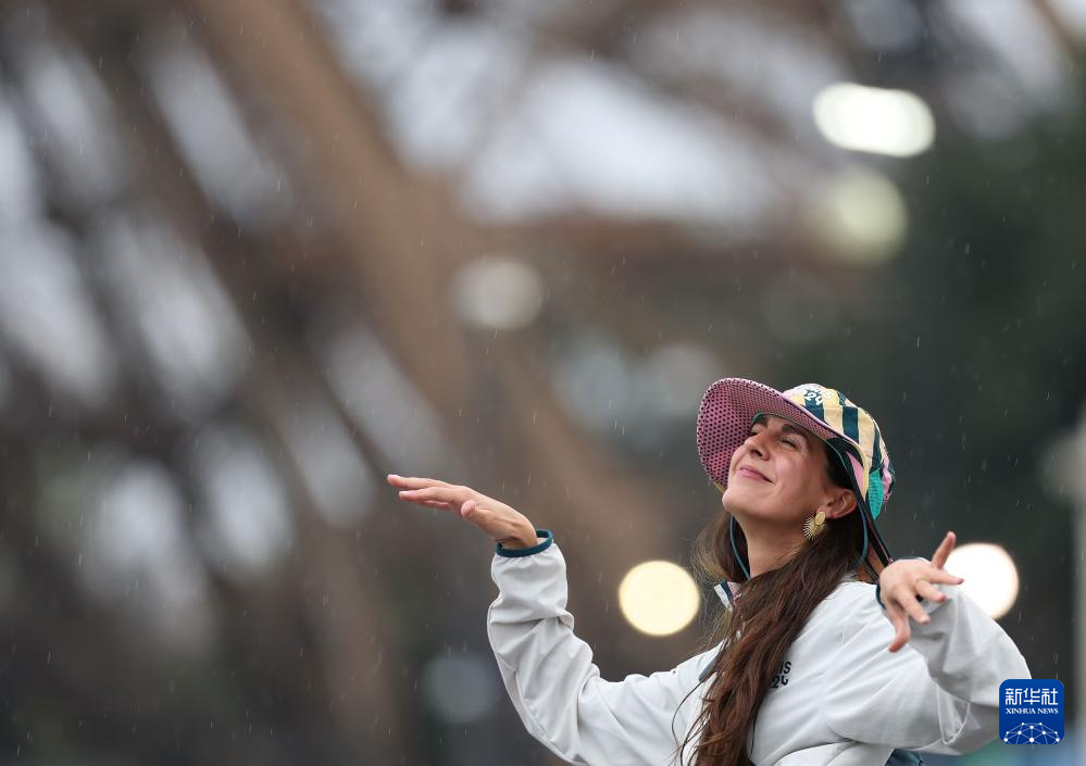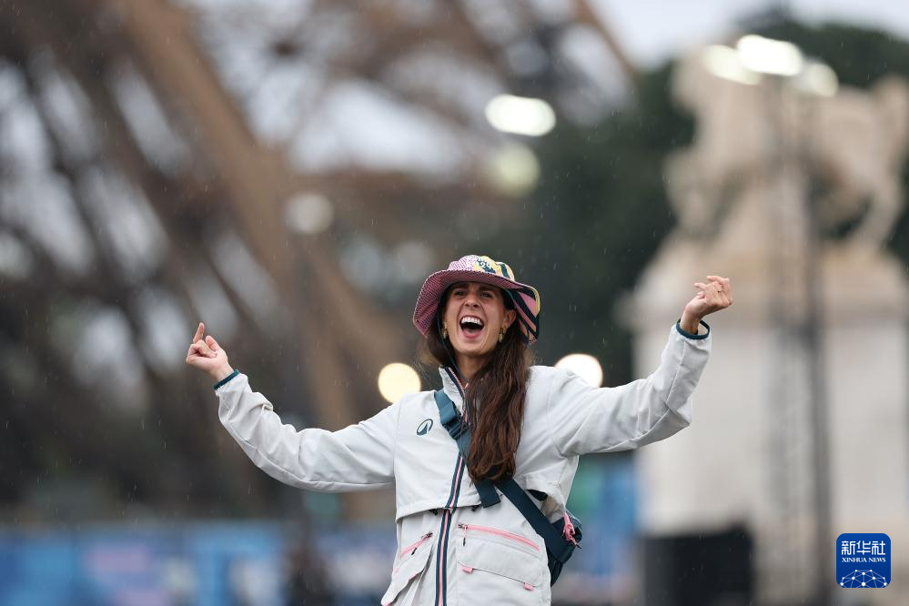 7月26日,一名志愿者在埃菲爾鐵塔前起舞。新華社記者 李明 攝