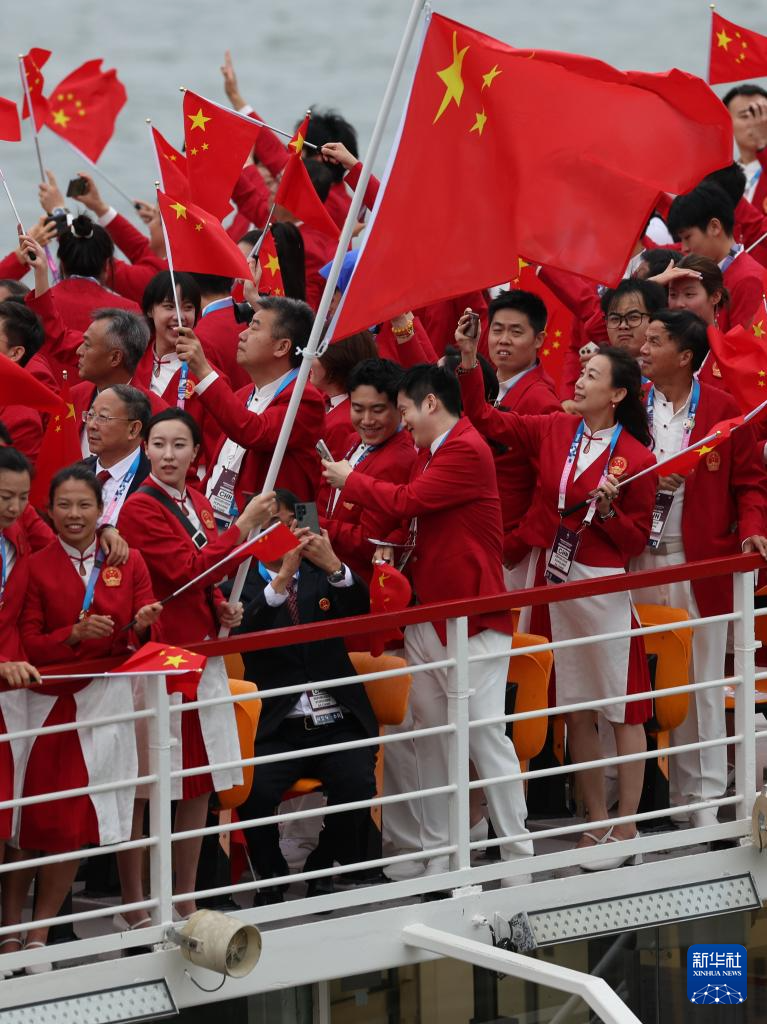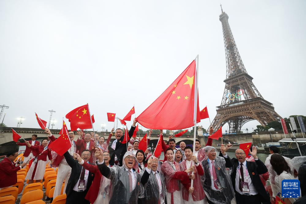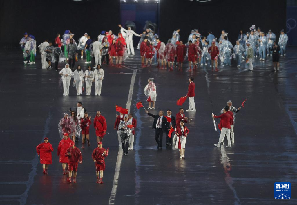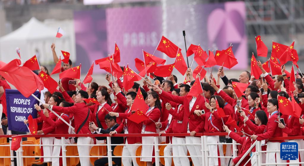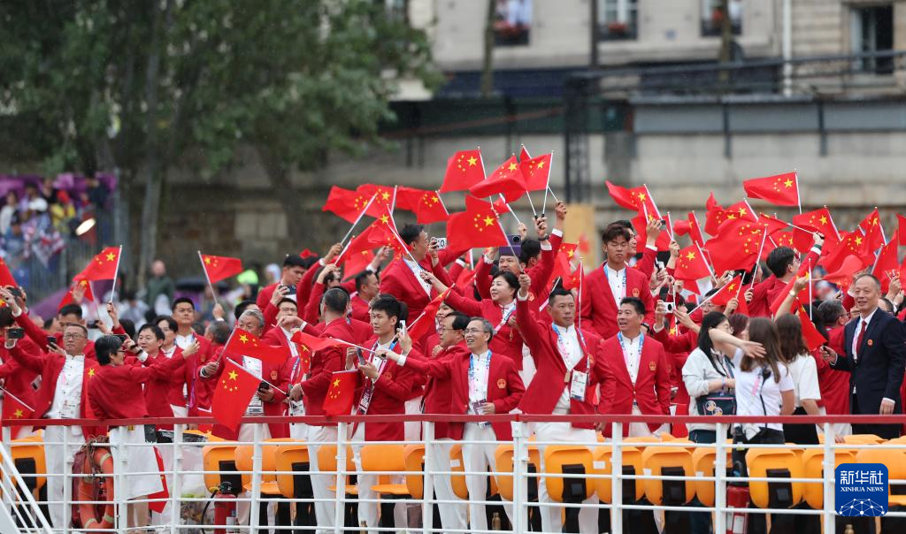 7月26日,中國(guó)體育代表團(tuán)成員在開幕式現(xiàn)場(chǎng)。新華社記者 王毓國(guó) 攝