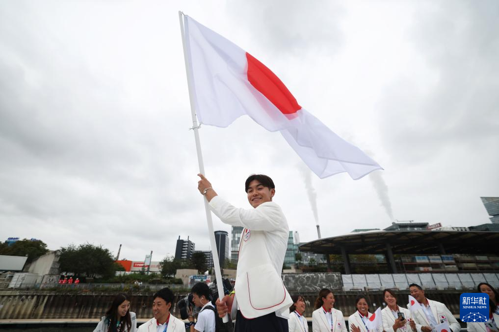 7月26日,日本體育代表團(tuán)旗手、霹靂舞運(yùn)動(dòng)員半井重幸在開幕式上揮舞國(guó)旗。新華社發(fā)(POOL照片/邁克爾·里夫斯)pagebreak