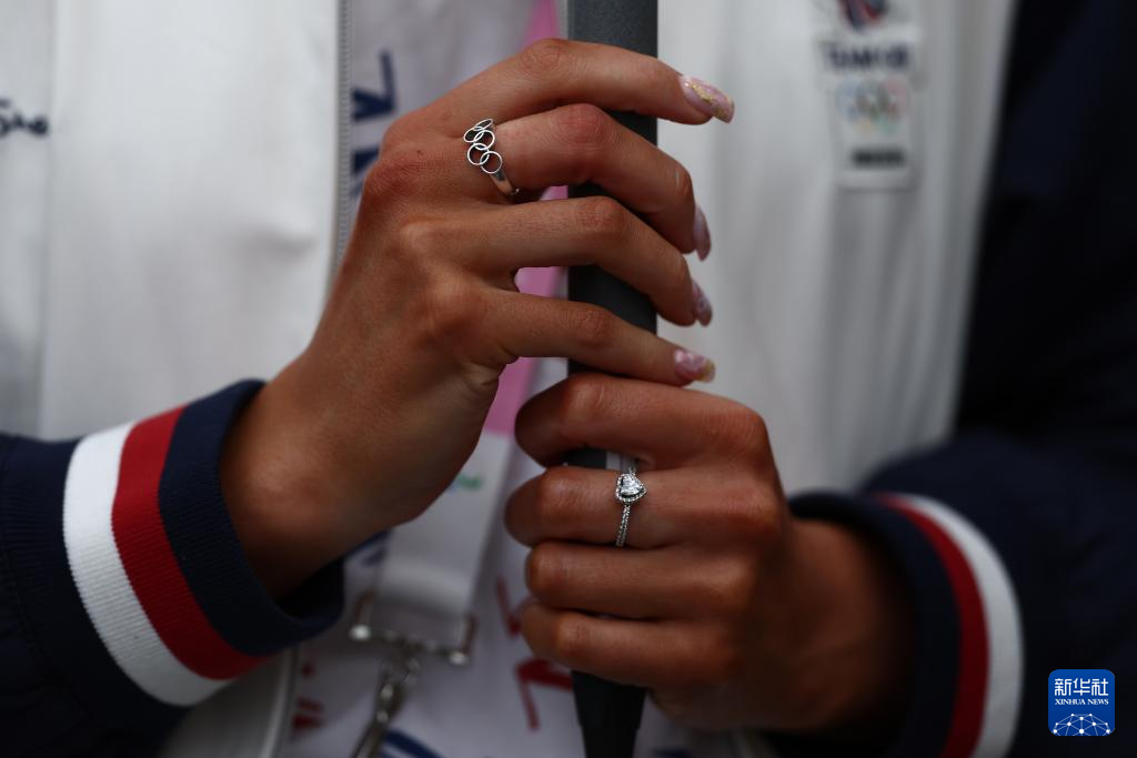 這是7月26日拍攝的一名英國(guó)體育代表團(tuán)成員佩戴的有奧運(yùn)五環(huán)元素的戒指。新華社發(fā)(POOL照片/娜奧米·貝克)