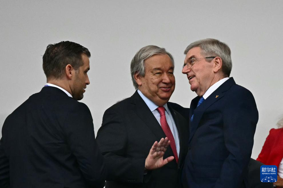 7月26日,聯(lián)合國(guó)秘書長(zhǎng)古特雷斯(右)與聯(lián)合國(guó)前秘書長(zhǎng)潘基文在開幕式前致意。新華社發(fā)(POOL照片/帕斯卡爾·勒·塞格雷坦)