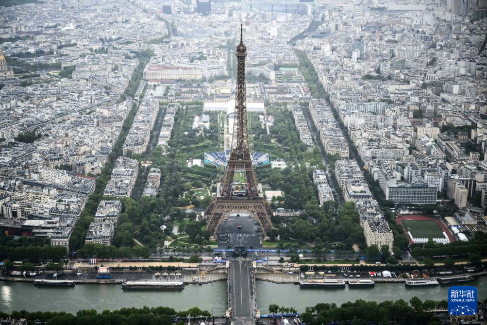 俯瞰開幕式上的埃菲爾鐵塔和戰(zhàn)神廣場(chǎng)(7月26日攝)。新華社發(fā)(POOL照片/利昂內(nèi)爾·博納旺蒂爾)