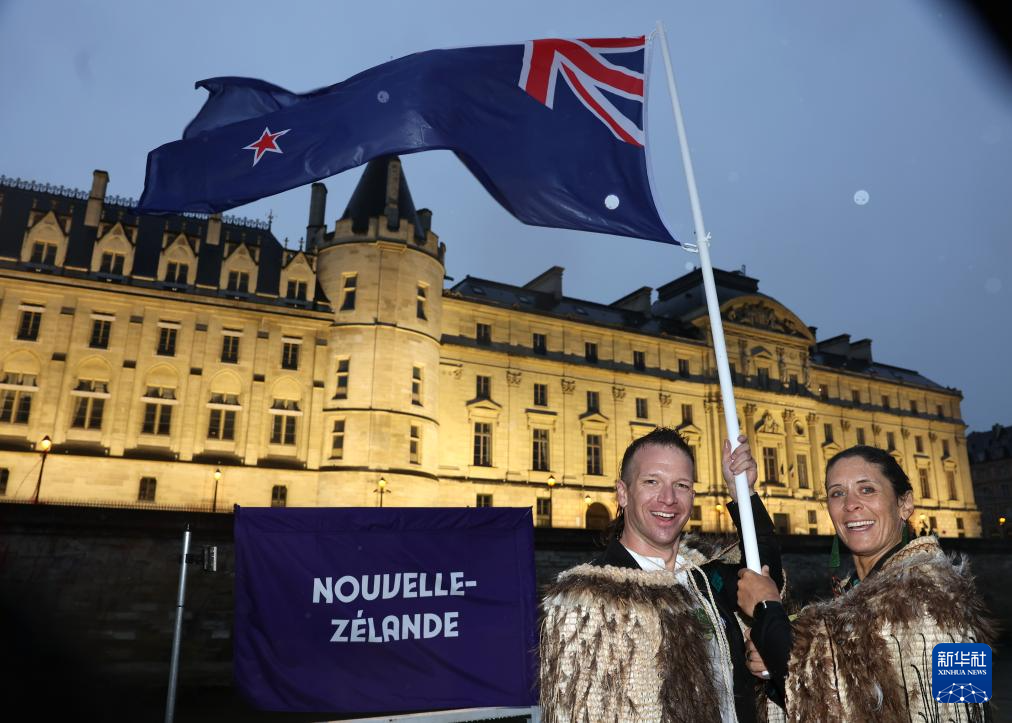 7月26日,新西蘭體育代表團(tuán)旗手阿倫·默里·蓋特(左)與橋·阿萊在開幕式上揮舞國(guó)旗。新華社發(fā)(POOL照片/漢娜·皮特斯)