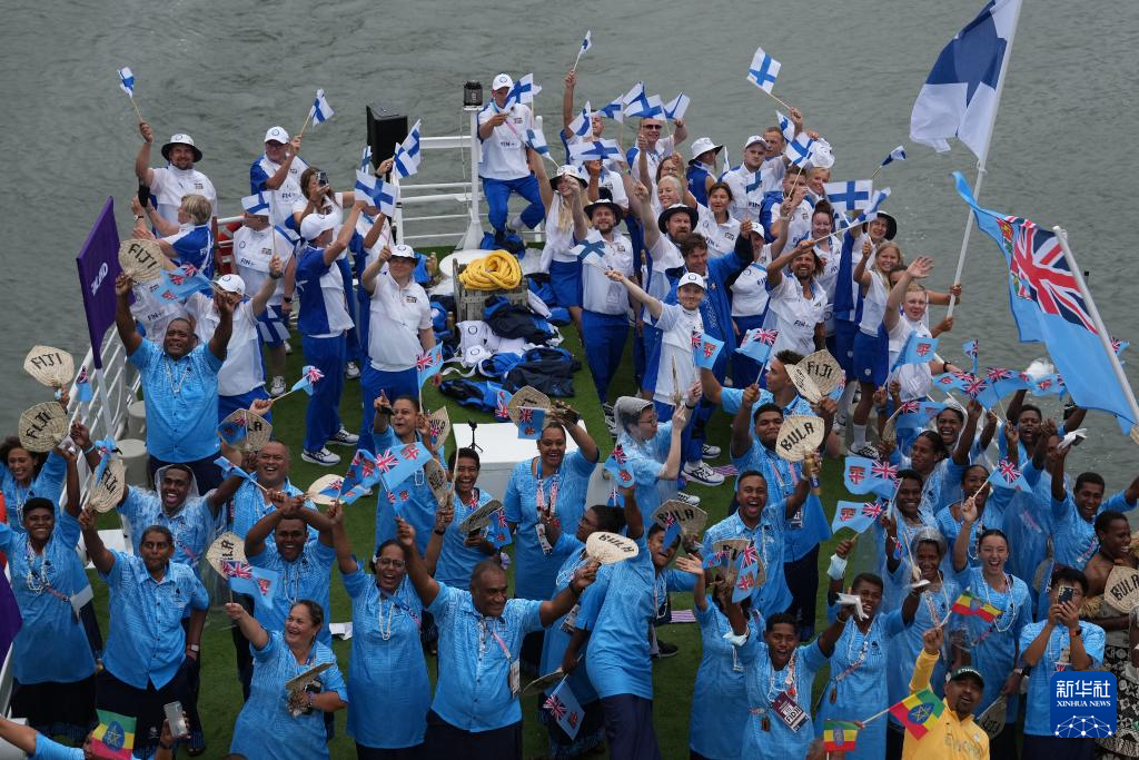 7月26日,芬蘭體育代表團(tuán)(上)與斐濟(jì)體育代表團(tuán)在開幕式上。新華社記者 萬(wàn)象 攝