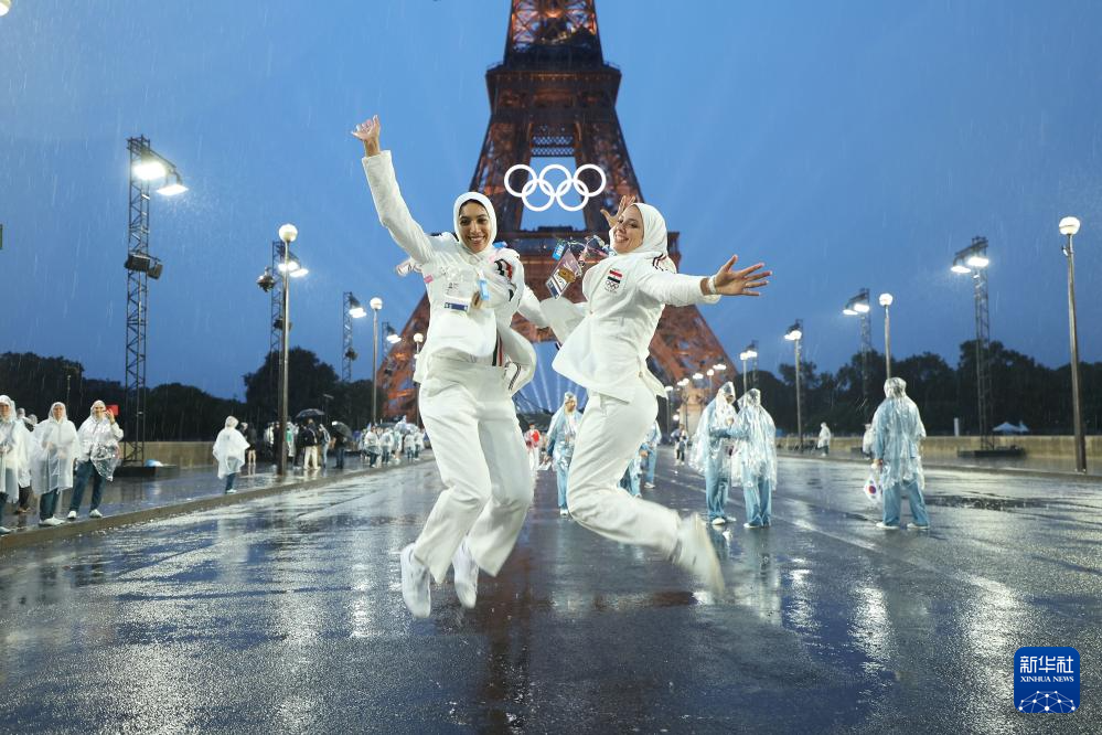 7月26日,埃及體育代表團(tuán)成員在埃菲爾鐵塔前。新華社記者 李明 攝