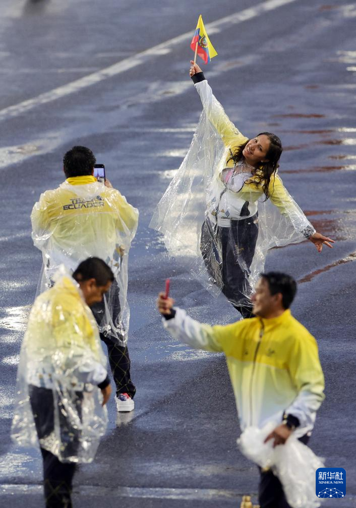 7月26日,厄瓜多爾體育代表團(tuán)進(jìn)入特羅卡德羅廣場(chǎng)。新華社記者 沈伯韓 攝