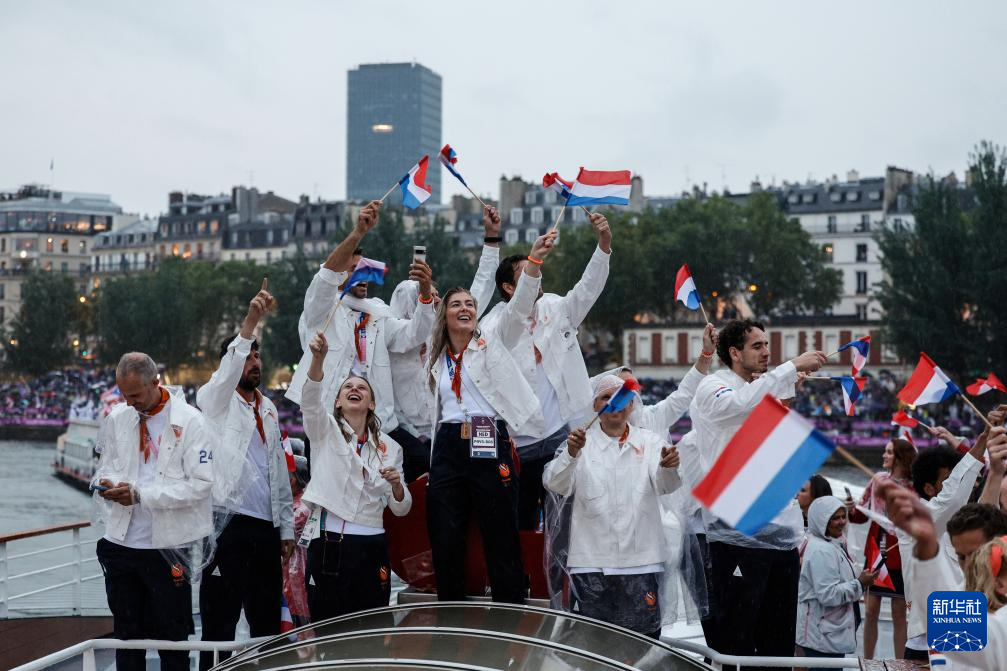 7月26日,荷蘭體育代表團(tuán)在開幕式上。新華社發(fā)(POOL照片/范德哈塞爾特)