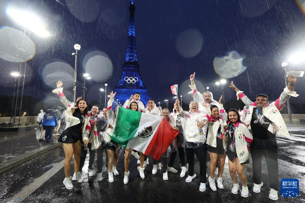 7月26日,墨西哥體育代表團(tuán)成員在埃菲爾鐵塔前。新華社記者 李明 攝