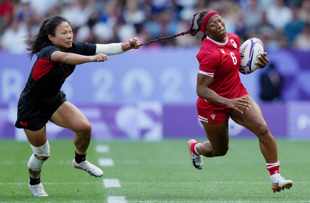 7月29日,中國隊球員劉瀟倩(左)與加拿大隊球員夏麗蒂·威廉姆斯在比賽中。當日,在巴黎奧運會七人制橄欖球女子分組循環(huán)賽A組比賽中,中國隊17比26不敵加拿大隊。 新華社記者 呂小煒 攝
