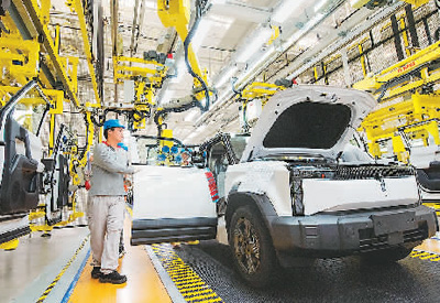 今年上半年,安徽省蕪湖市出口電動(dòng)載人汽車數(shù)量1.49萬輛,同比增長144.3%。圖為在蕪湖市奇瑞新能源愛咖生態(tài)科技有限公司新能源汽車生產(chǎn)車間,工人在進(jìn)行組裝生產(chǎn)作業(yè)。