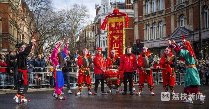 當(dāng)?shù)貢r(shí)間 2024 年 2 月 11 日,陳來(lái)發(fā)教練率領(lǐng)廣東普寧南山英歌隊(duì)的近 20 名舞者現(xiàn)身英國(guó)倫敦,揭開(kāi)了當(dāng)?shù)匦麓簯c典的帷幕,這也是普寧英歌首次出海。與此同時(shí),千里之外的普寧市內(nèi)另有一支南山英歌隊(duì)伍正穿梭于街巷,為市民驅(qū)邪扶正,帶隊(duì)者之一正是陳揚(yáng)波。