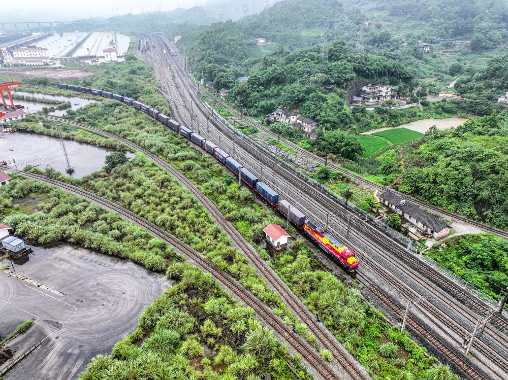 西部陸海新通道中老泰馬跨境鐵路班列在重慶江津小南埡站等待發(fā)車。新華社記者 唐奕 攝